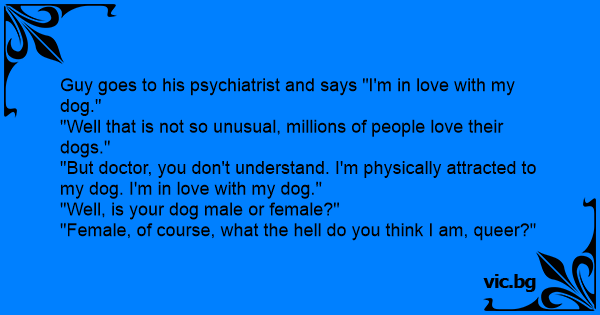 Arzt: „Was fehlt Ihnen?“ Patient: „Herr Doktor, ich liebe meinen Hund.“ Arzt: „Tut mir Leid. Als Krankheit ist das nicht anerkannt. Ich kann da nichts machen.“ Patient: „Aber Herr Doktor, ich liebe meinen Hund physisch …“ Arzt: “ Oh, ist es eine Hündin oder ein Rüde?“ Patient: „Eine Hündin...