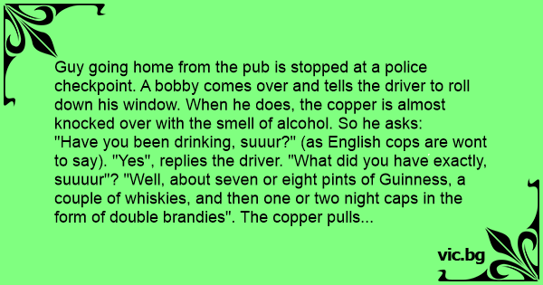 Guy going home from the pub is stopped at a police checkpoint. A bobby comes over and tells the driver to roll down his window. When he does, the copper is almost knocked over with the smell of alcohol. So he asks: