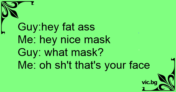 Guy:hey fат ass<br />Me: hey nice mask<br />Guy: what mask?<br />Me: oh sh't that's your face