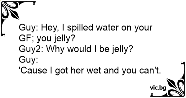 Guy: Hey, I spilled water on your GF; you jelly?