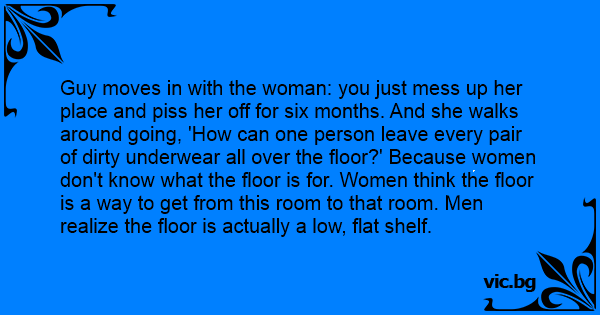 Guy moves in with the woman: you just mess up her place and рiss her off for six months. And she walks around going, 'How can one person leave every pair of dirтy underwear all over the floor?' Because women don't know what the floor is for. Women think the floor is a way to get from this room to that room. Men realize the floor is actually a low, flat shelf.