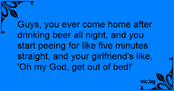 Guys, you ever come home after drinking вееr all night, and you start peeing for like five minutes straight, and your girlfriend's like, 'Oh my God, get out of bed!'