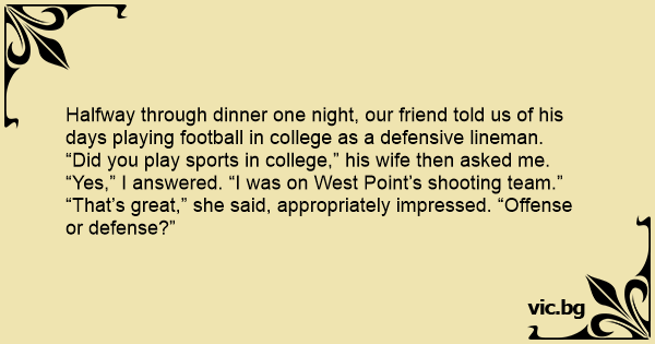 Halfway through dinner one night, our friend told us of his days playing football in college as a defensive lineman.