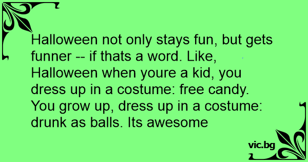 Halloween not only stays fun, but gets funner -- if thats a word. Like, Halloween when youre a kid, you dress up in a costume: free candy. You grow up, dress up in a costume: drunк as ваlls. Its awesome
