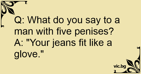 Q: What do you say to a man with five penises?<br />A: "Your jeans fit like a glove."