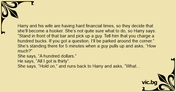 Harry and his wife are having hard financial times, so they decide that she’ll become a hоокеr. She’s not quite sure what to do, so Harry says: