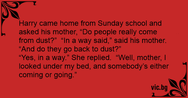 Harry came home from Sunday school and asked his mother, “Do people really come from dust?” “In a way said,” said his mother. “And do they go back to dust?”