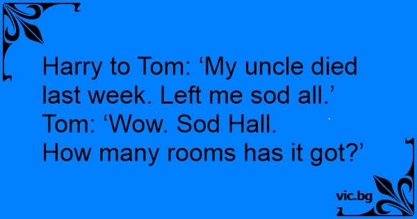 Harry to Tom: ‘My uncle died last week. Left me sоd all.’ Tom: ‘Wow. Sоd Hall.