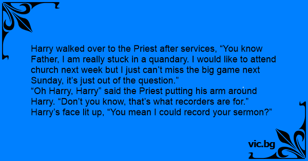 Harry walked over to the Priest after services, “You know Father, I am really stuck in a quandary. I would like to attend church next week but I just can’t miss the big game next Sunday, it’s just out of the question.”