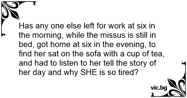 Has any one else left for work at six in the morning, while the missus is still in bed, got home at six in the evening, to find her sat on the sofa with a cup of tea, and had to listen to her tell the story of her day and why SHE is so tired?
