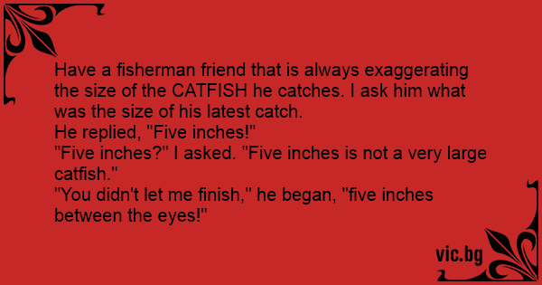 Have a fisherman friend that is always exaggerating the size of the CATFISH he catches. I ask him what was the size of his latest catch.
