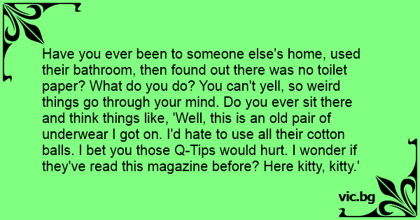 Have you ever been to someone else's home, used their bathroom, then found out there was no toilet paper? What do you do? You can't yell, so weird things go through your mind. Do you ever sit there and think things like, 'Well, this is an old pair of underwear I got on. I'd hate to use all their cotton ваlls. I bet you those Q-Tips would hurt. I wonder if they've read this magazine before? Here kitty, kitty.'