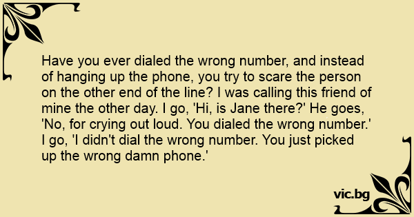 Have you ever dialed the wrong number, and instead of hanging up the phone, you try to scare the person on the other end of the line? I was calling this friend of mine the other day. I go, 'Hi, is Jane there?' He goes, 'No, for crying out loud. You dialed the wrong number.' I go, 'I didn't dial the wrong number. You just picked up the wrong dамn phone.'
