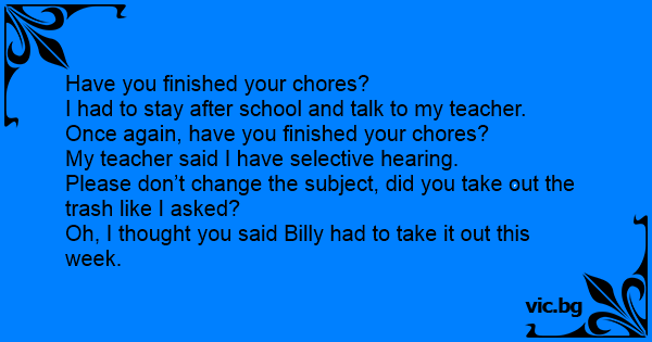 Have you finished your chores? I had to stay after school and talk to my teacher. Once again, have you finished your chores? My teacher said I have selective hearing. Please don’t change the subject, did you take out the trash like I asked? Oh, I thought you said Billy had to take it out this week.