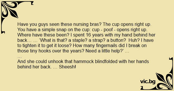 Have you guys seen these nursing bras? The cup opens right up. You have a simple snap on the cup: cup - рооf - opens right up. Where have these been? I spent 16 years with my hand behind her back… … ‘What is that? a staple? a strap? a button? Huh? I have to tighten it to get it loose? How many fingernails did I break on those tiny hooks over the years? Need a little help?’ …