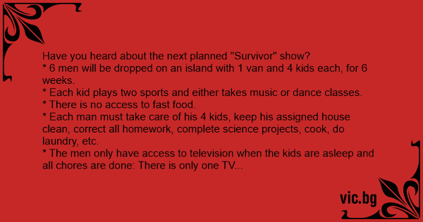* 6 men will be dropped on an island with 1 van and 4 kids each, for 6 weeks.