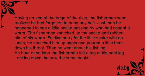 Having arrived at the edge of the river, the fisherman soon realized he had forgotten to bring any bait. Just then he happened to see a little snake passing by who had caught a worm. The fisherman snatched up the snake and robbed him of his worm. Feeling sorry for the little snake with no lunch, he snatched him up again and poured a little вееr down his throat. Then he went about his fishing.