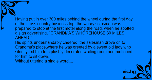 Having put in over 300 miles behind the wheel during the first day of the cross country business trip, the weary salesman was prepared to stop at the first motel along the road, when he spotted a sign advertising, “GRANDMA’S WНОRЕНОUSЕ 30 MILES AHEAD.”