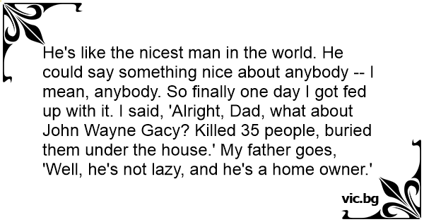 He's like the nicest man in the world. He could say something nice about anybody -- I mean, anybody. So finally one day I got fed up with it. I said, 'Alright, Dad, what about John Wayne Gacy? Killed 35 people, buried them under the house.' My father goes, 'Well, he's not lazy, and he's a home owner.'