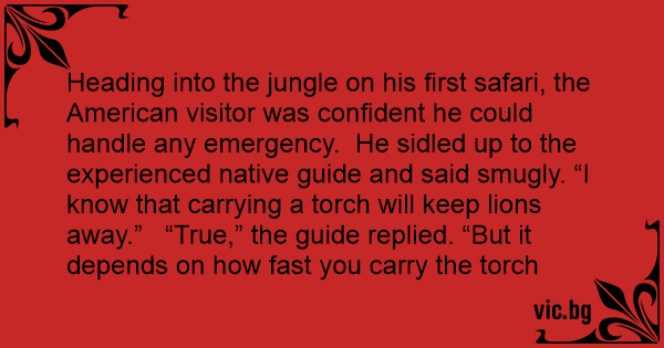 Heading into the jungle on his first safari, the American visitor was confident he could handle any emergency. He sidled up to the experienced native guide and said smugly. “I know that carrying a torch will keep lions away.” “True,” the guide replied. “But it depends on how fast you carry the torch