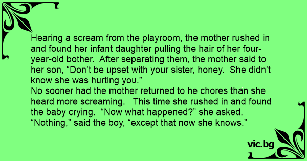 Šestiletý synek přiběhne za maminkou s brekem, že ho jeho malá sestřička tahá za vlasy. Maminka mu vysvětluje: „Přestaň brečet. Ona je ještě malá a neví, že tahání za vlasy bolí.” Synek odejde a za...