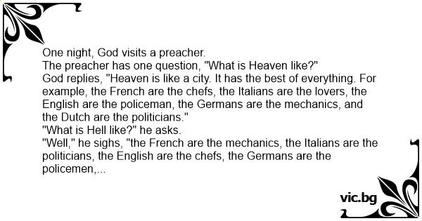 God replies, "Heaven is like a city. It has the best of everything. For example, the French are the chefs, the Italians are the lovers, the English are the policeman, the Germans are the mechanics, and the Dutch are the politicians."