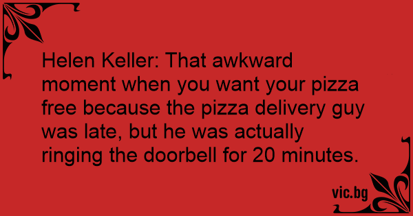 Helen Keller: That awkward moment when you want your pizza free because the pizza delivery guy was late, but he was actually ringing the doorbell for 20 minutes.