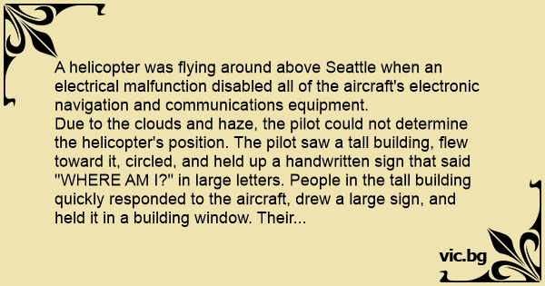Due to the clouds and haze, the pilot could not determine the helicopter's position. The pilot saw a tall building, flew toward it, circled, and held up a handwritten sign that said "WHERE AM I?" in large letters. People in the tall building quickly responded to the aircraft, drew a large sign, and held it in a building window. Their sign said "YOU ARE IN A HELICOPTER."