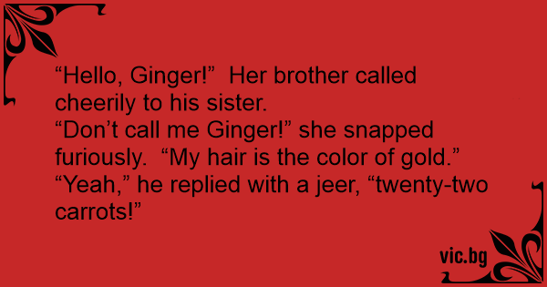 “Hello, Gingеr!” Her brother called cheerily to his sister.<br />“Don’t call me Gingеr!” she snapped furiously. “My hair is the color of gold.”<br />“Yeah,” he replied with a jeer, “twenty-two carrots!”