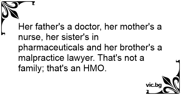 Her father's a doctor, her mother's a nurse, her sister's in pharmaceuticals and her brother's a malpractice lawyer. That's not a family; that's an HMO.