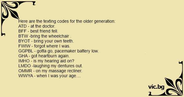 Here are the texting codes for the older generation: