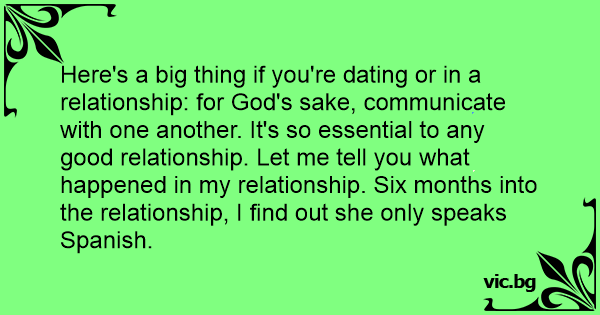 Here's a big thing if you're dating or in a relationship: for God's sake, communicate with one another. It's so essential to any good relationship. Let me tell you what happened in my relationship. Six months into the relationship, I find out she only speaks Spanish.