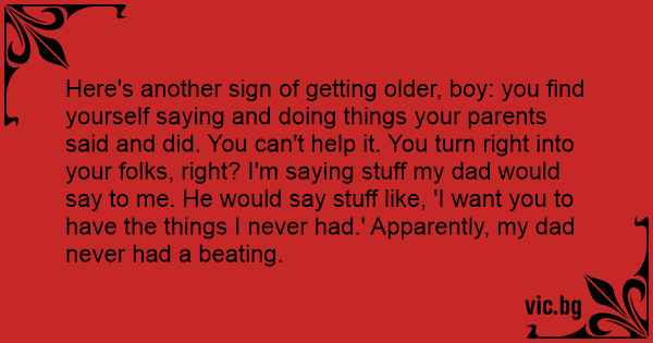 Here's another sign of getting older, boy: you find yourself saying and doing things your parents said and did. You can't help it. You turn right into your folks, right? I'm saying stuff my dad would say to me. He would say stuff like, 'I want you to have the things I never had.' Apparently, my dad never had a beating.