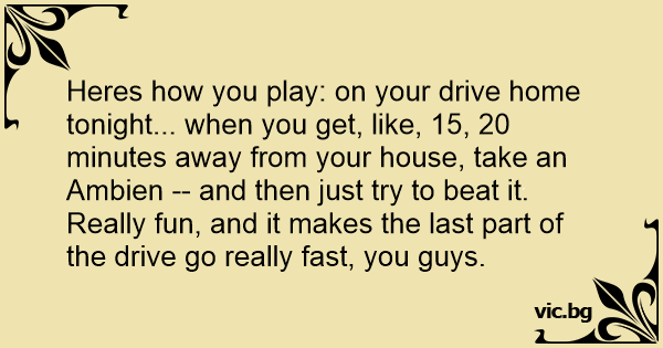 Heres how you play: on your drive home tonight... when you get, like, 15, 20 minutes away from your house, take an Ambien -- and then just try to beat it. Really fun, and it makes the last part of the drive go really fast, you guys.