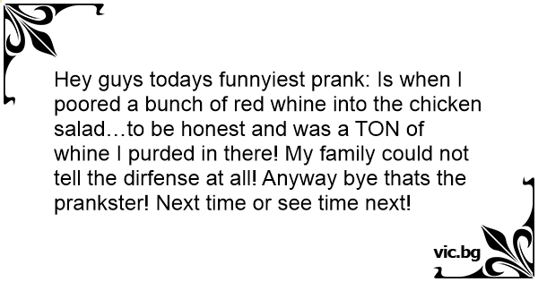 Hey guys todays funnyiest prank: Is when I poored a bunch of red whine into the chicken salad…to be honest and was a TON of whine I purded in there! My family could not tell the dirfense at all! Anyway bye thats the prankster! Next time or see time next!