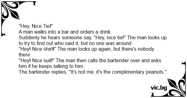 Suddenly he hears someone say, "Hey, nice tie!" The man looks up to try to find out who said it, but no one was around.
