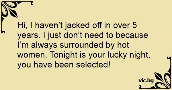 Hi, I haven’t jacked off in over 5 years. I just don’t need to because I’m always surrounded by hot women. Tonight is your lucky night, you have been selected!