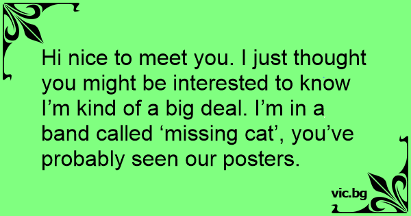 Hi nice to meet you. I just thought you might be interested to know I’m kind of a big deal. I’m in a band called ‘missing cat’, you’ve probably seen our posters.