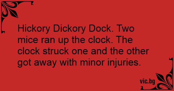 Hickory Dickory Dock. Two mice ran up the clock. The clock struck one and the other got away with minor injuries.