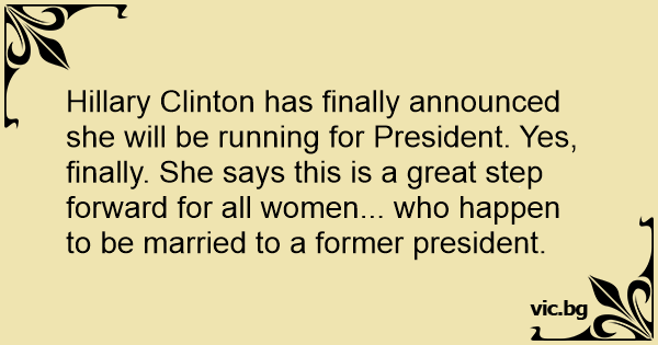 Hillary Clinton has finally announced she will be running for President. Yes, finally. She says this is a great step forward for all women... who happen to be married to a former president.