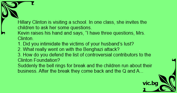 Suddenly the веll rings for break and the children run about their business. After the break they come back and the Q and A period resumes. Joel raises his hand and says, “I have five questions, Mrs. Clinton.