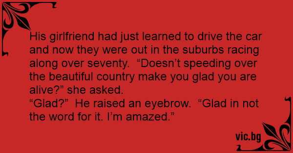 His girlfriend had just learned to drive the car and now they were out in the suburbs racing along over seventy. “Doesn’t speeding over the beautiful country make you glad you are alive?” she asked.