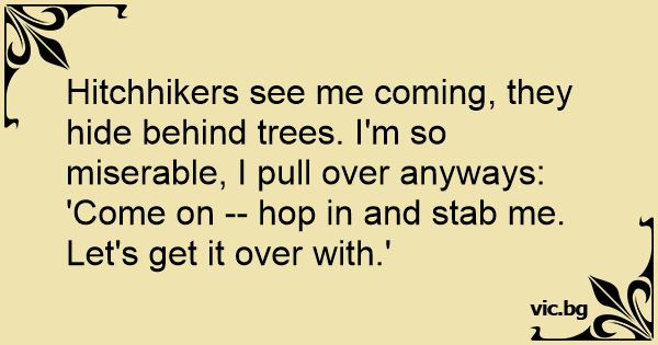Hitchhikers see me coming, they hide behind trees. I'm so miserable, I pull over anyways: