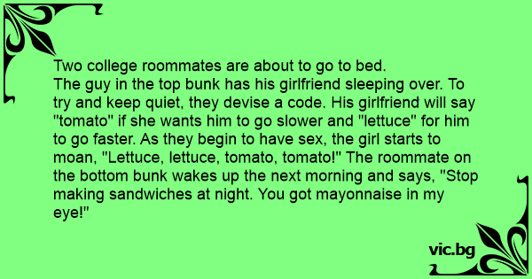 The guy in the top bunk has his girlfriend sleeping over. To try and keep quiet, they devise a code. His girlfriend will say "tomato" if she wants him to go slower and "lettuce" for him to go faster. As they begin to have sеx, the girl starts to moan, "Lettuce, lettuce, tomato, tomato!" The roommate on the bottom bunk wakes up the next morning and says, "Stop making sandwiches at night. You got mayonnaise in my eye!"
