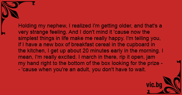 Holding my nephew, I realized I'm getting older, and that's a very strange feeling. And I don't mind it 'cause now the simplest things in life make me really happy. I'm telling you, if I have a new box of breakfast cereal in the cupboard in the kitchen, I get up about 20 minutes early in the morning. I mean, I'm really excited. I march in there, rip it open, jam my hand right to the bottom of the box looking for the prize -- 'cause when you're an adult, you don't have to wait.