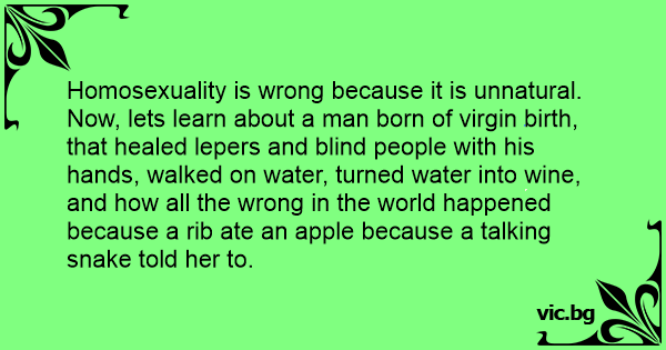 Homosexuality is wrong because it is unnatural. Now, lets learn about a man born of virgin birth, that healed lepers and blind people with his hands, walked on water, turned water into wine, and how all the wrong in the world happened because a rib ate an apple because a talking snake told her to.