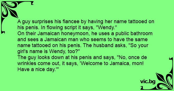 On their Jamaican honeymoon, he uses a public bathroom and sees a Jamaican man who seems to have the same name tattooed on his реnis. The husband asks, "So your girl's name is Wendy, too?"
