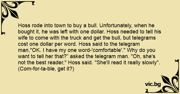 Hoss rode into town to buy a bull. Unfortunately, when he bought it, he was left with one dollar. Hoss needed to tell his wife to come with the truck and get the bull, but telegrams cost one dollar per word. Hoss said to the telegram man,"OK. I have my one word-'comfortable'." Why do you want to tell her that?” asked the telegram man. "Oh, she's not the best reader," Hoss said. "She'll read it really slowly". (Com-for-ta-ble, get it?)