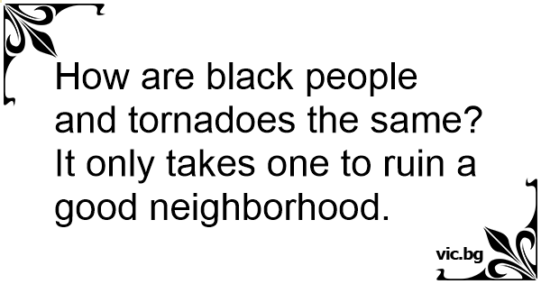How are black people and tornadoes the same? It only takes one to ruin a good neighborhood.