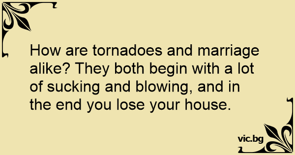 How are tornadoes and marriage alike? They both begin with a lot of suскing and blowing, and in the end you lose your house.